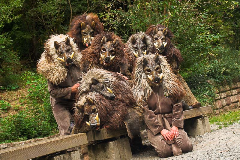 Frischlinge haben in den ersten Wochen nach der Geburt ein längsgestreiftes Fell. Diese gelb-braune Färbung ist eine Tarnung der Jungtiere. Damit passen sie sich perfekt ihrem ursprünglichen Lebensraum an: Laubwälder mit Eichen und Buchen und Waldlichtungen mit Wiesen. Besonders gerne schubbern sich Frischlinge ihr Fell an Bäumen, um es zu säubern. Die große Anzahl an Nachwuchs und deren Wunsch ebenfalls eine Maske zu tragen war der Ansporn, eine kleinere Kindermaske in Form eines Frischlings zu entwerfen. 1993 war es dann so weit. Unser Nachwuchs bekam eine eigene Maske, die das Bild der Rotte weiter verstärkte.